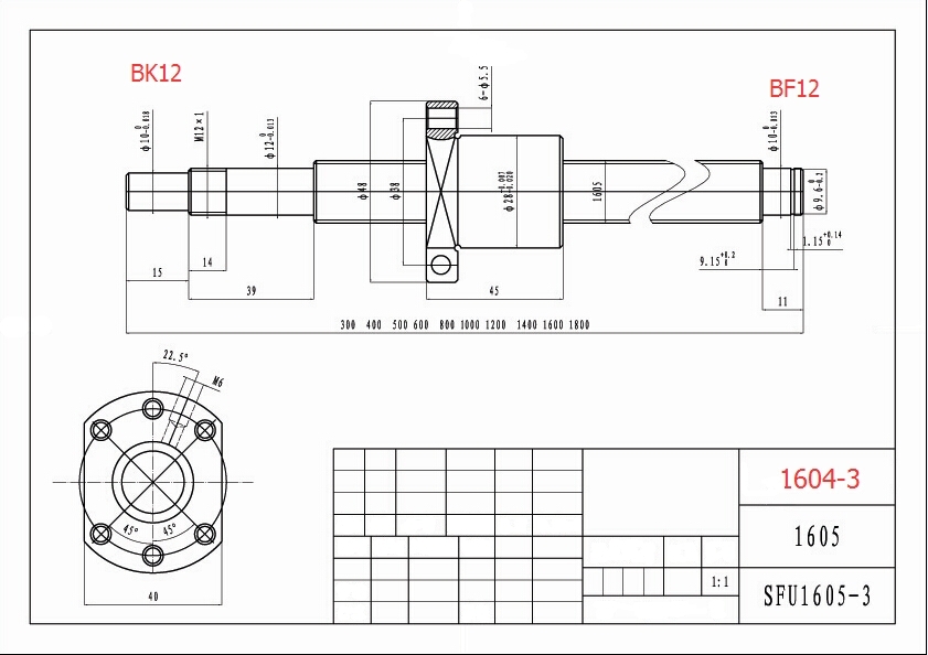 SFU1605 – одинарная ШВП гайка с номинальным диаметром винта 16мм и шагом резьбы 5мм. Наружный диаметр гайки 28мм, длина гайки с фланцем 42мм. Фланец DIN 69051 B (ISO 3408) с шестью монтажными отверстиями диаметром 5,5мм. Диаметр фланца 48мм, толщина 10мм. Диаметр шариков 3.175мм. Возвратные каналы закрыты металлическими заглушками с резьбой М6. Манжеты резиновые, подпружиненные. Динамическая грузоподъемность Са - 780Н, статическая грузоподъемность Соа - 1790Н. Коэффициент жесткости К - 20кгс/мкм, что означает изменение осевого перемещения на 1 мкм при осевом контр усилии 20кгс.