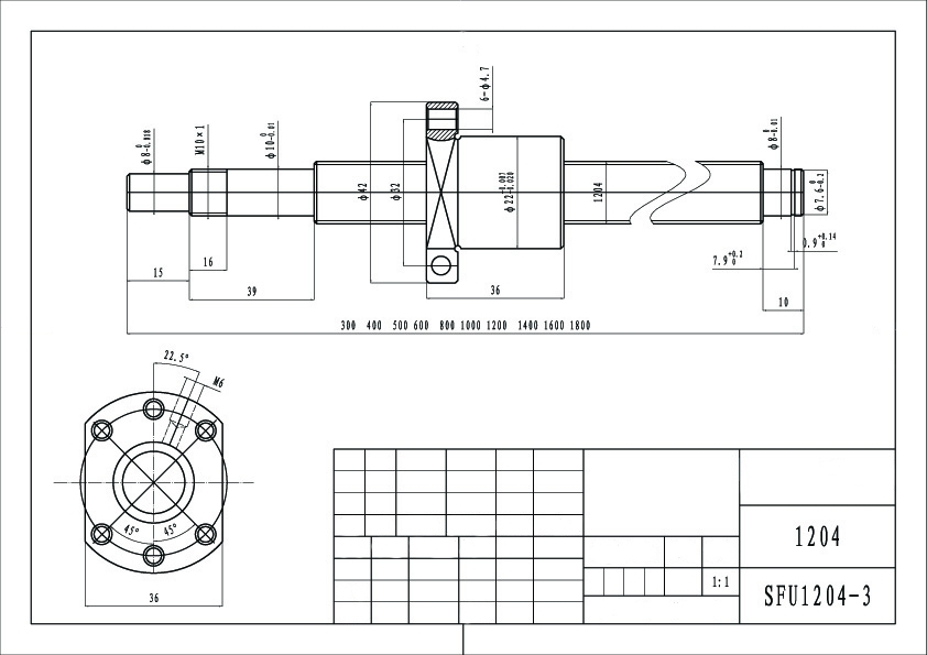SFU1204 – одинарная ШВП гайка с номинальным диаметром винта 12мм и шагом резьбы 4мм. Наружный диаметр гайки 22мм, длина гайки с фланцем 35мм. Фланец DIN 69051 B (ISO 3408) с шестью монтажными отверстиями диаметром 4,8мм. Диаметр фланца 42мм, толщина 8мм. Диаметр шариков 2,5мм. Возвратные каналы закрыты металлическими заглушками с резьбой М6. Манжеты резиновые, подпружиненные. Динамическая грузоподъемность Са - 593Н, статическая грузоподъемность Соа - 1129Н. Коэффициент жесткости К - 12,5кгс/мкм, что означает изменение осевого перемещения на 1 мкм при осевом контр усилии 12,5кгс.
