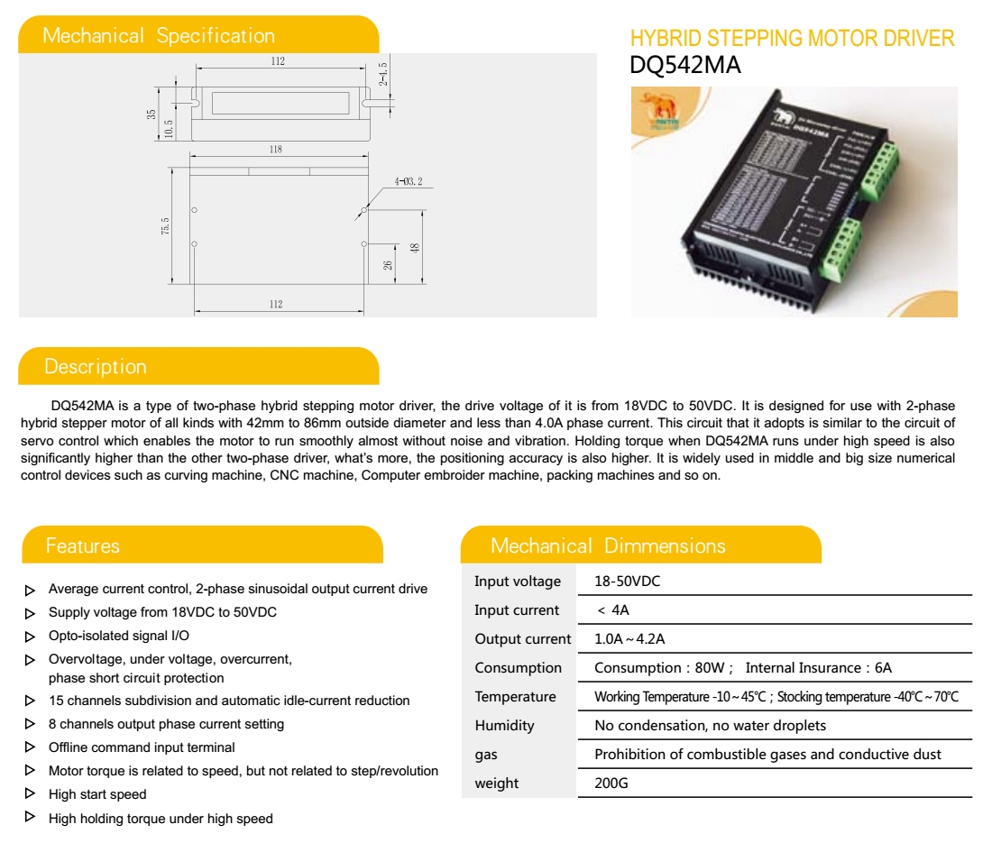 Драйвер шагового двигателя DQ542MA представляет собой драйвер для двухфазныx гибридных шаговых двигателей, рассчитаных на напряжение от 18В до 50В. Он предназначен для использования с 2-фазными гибридными шаговыми двигателями всех видов с наружным диаметром от 42мм до 86мм и фазным током не более 4.0A. Примененная схема подобна схемам управления сервоприводом, что позволяет обеспечить плавную работу двигателя почти без шума и вибрации. Суммарный крутящий момент при работе DQ542MA на высокой скорости значительно выше, чем у других двухфазных драйверов, более того, точность позиционирования также выше. Он широко используется в устройствах с числовым программным управлением средней и большой мощности, таких как листогибы с числовым программным управлением, вышивальные машины с компьютерным управлением, упаковочные машины и другие.